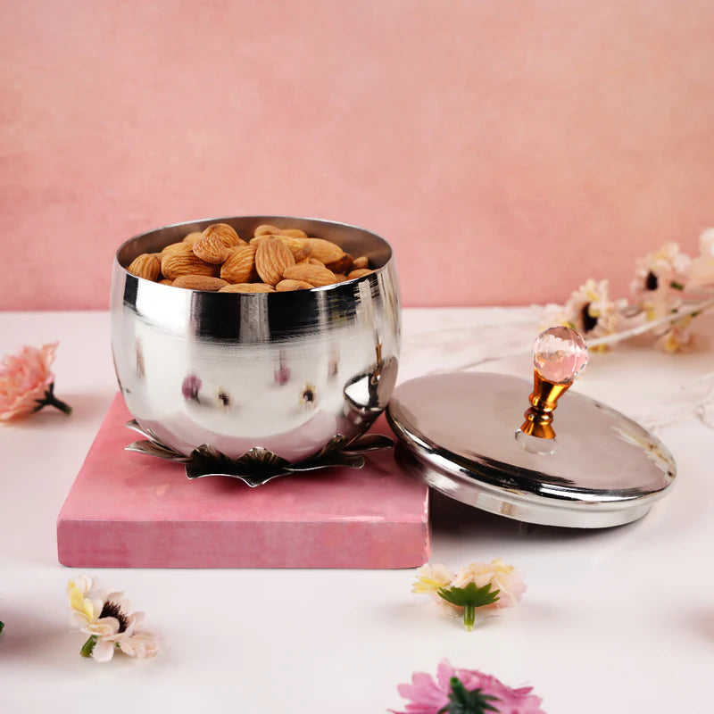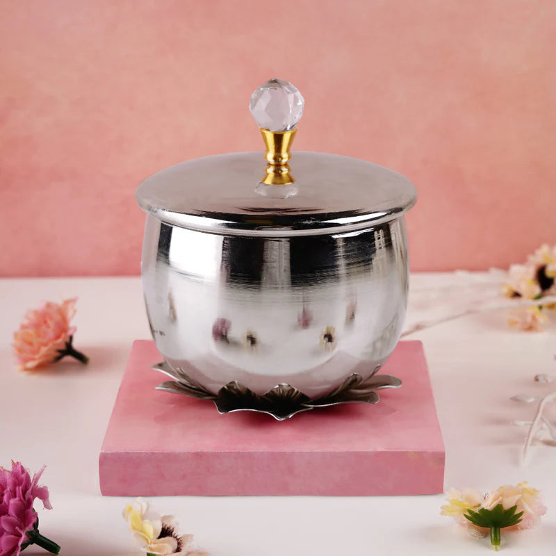 Metal Sliver Plated Jar With Elephant Legs & Wooden Lid