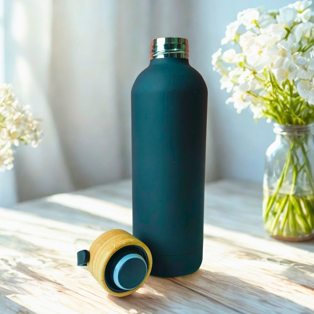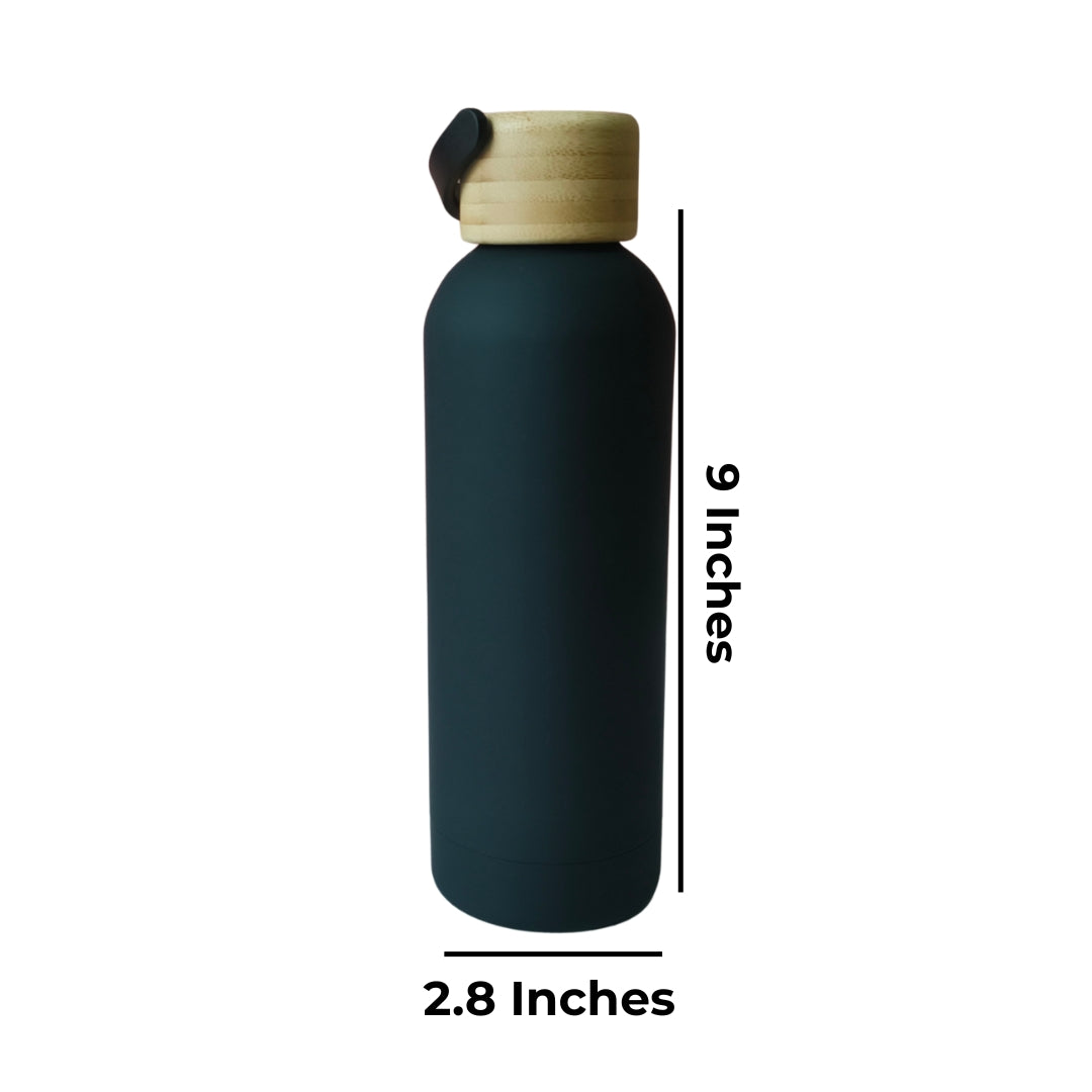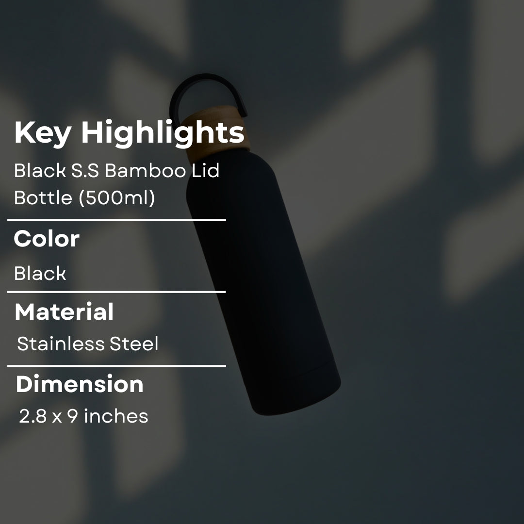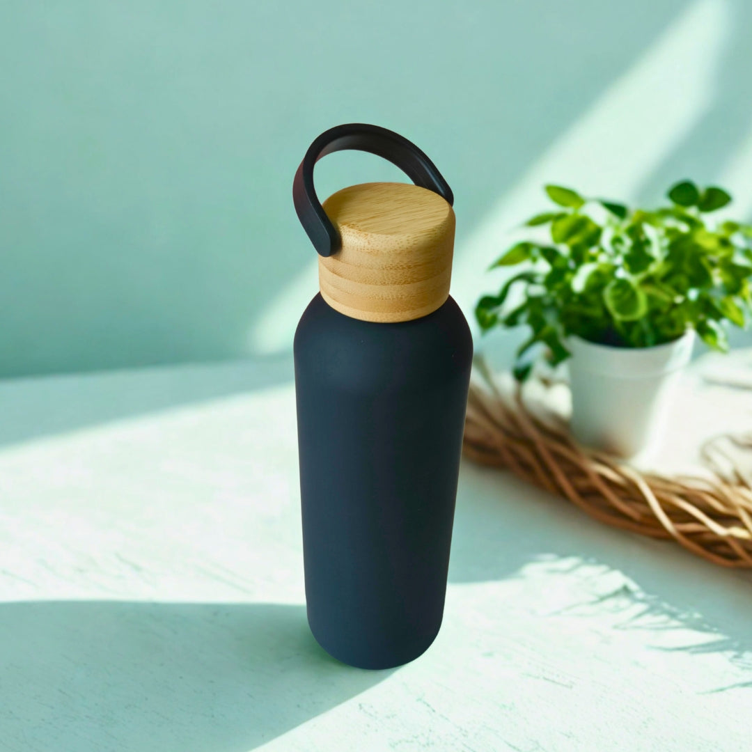 Black Stainless Steel Bottle With Bamboo Lid And Handle (500ml)