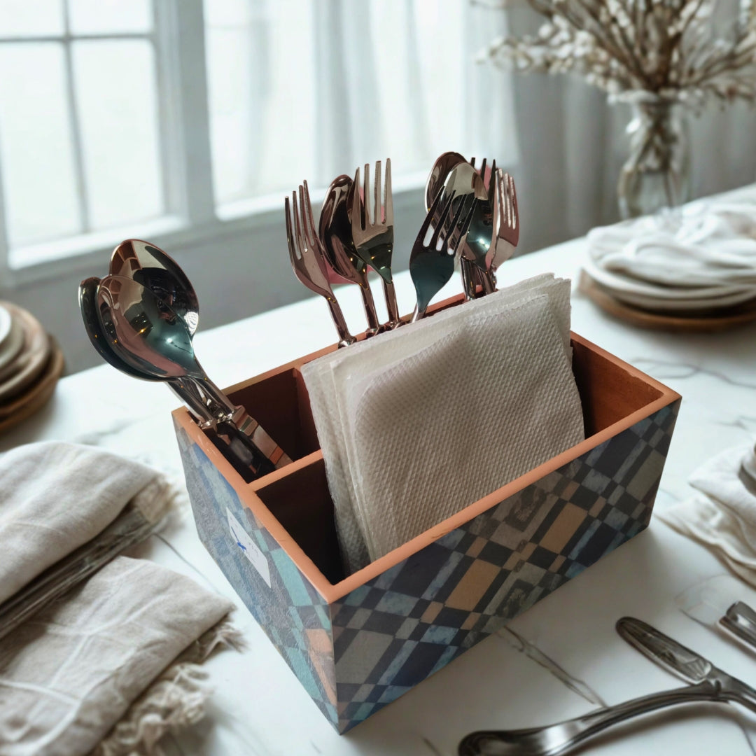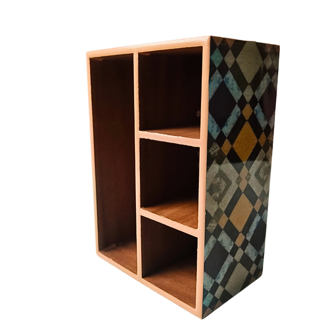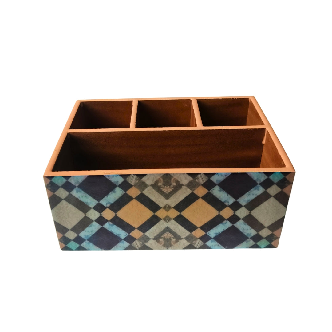 Caddy - Wooden 4 Partition Blue & Brown Diamond Print With Enamel