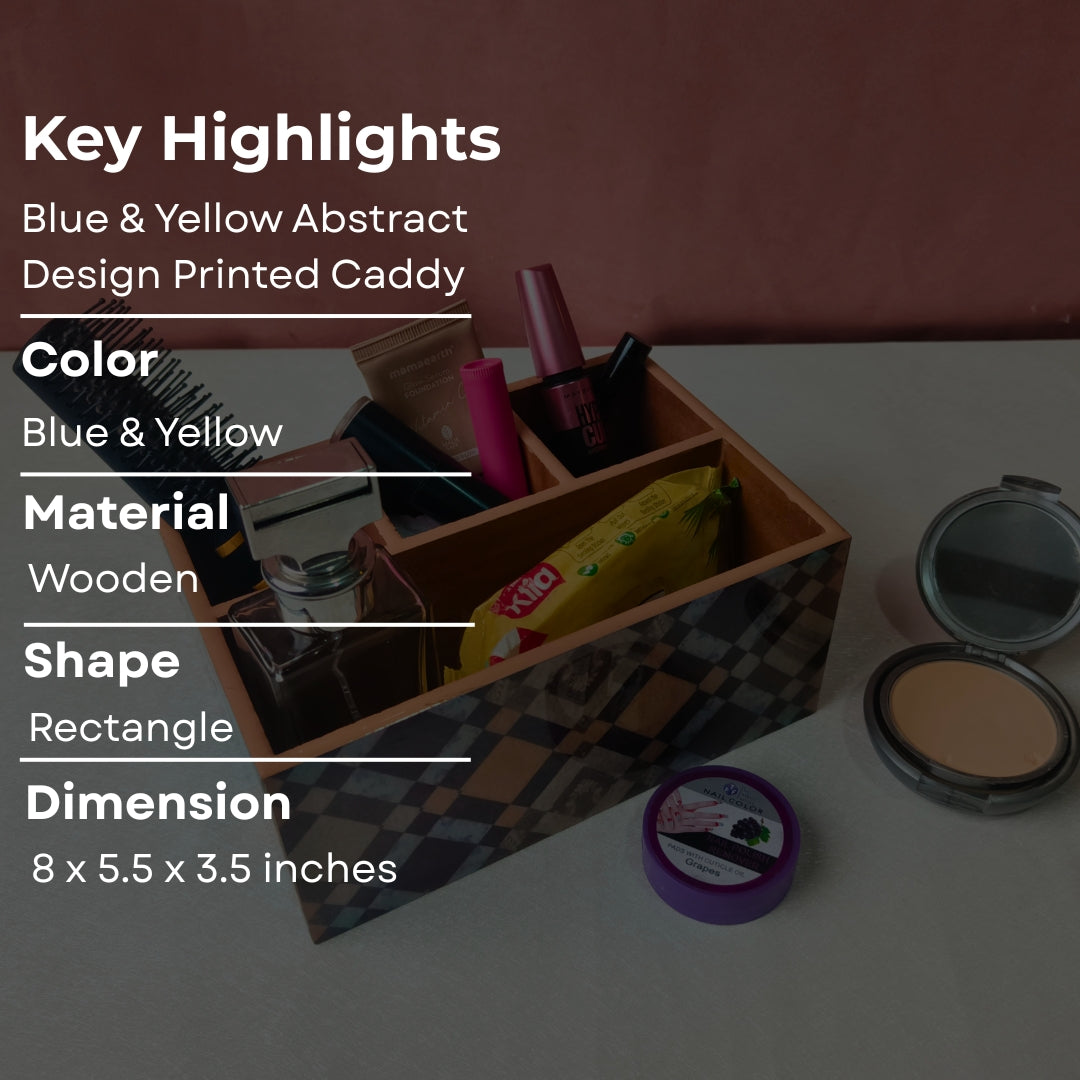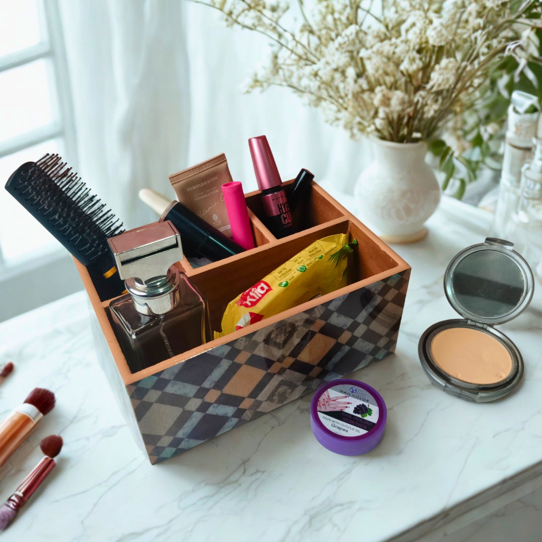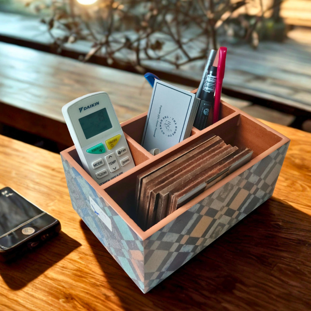 Caddy - Wooden 4 Partition Blue & Brown Diamond Print With Enamel