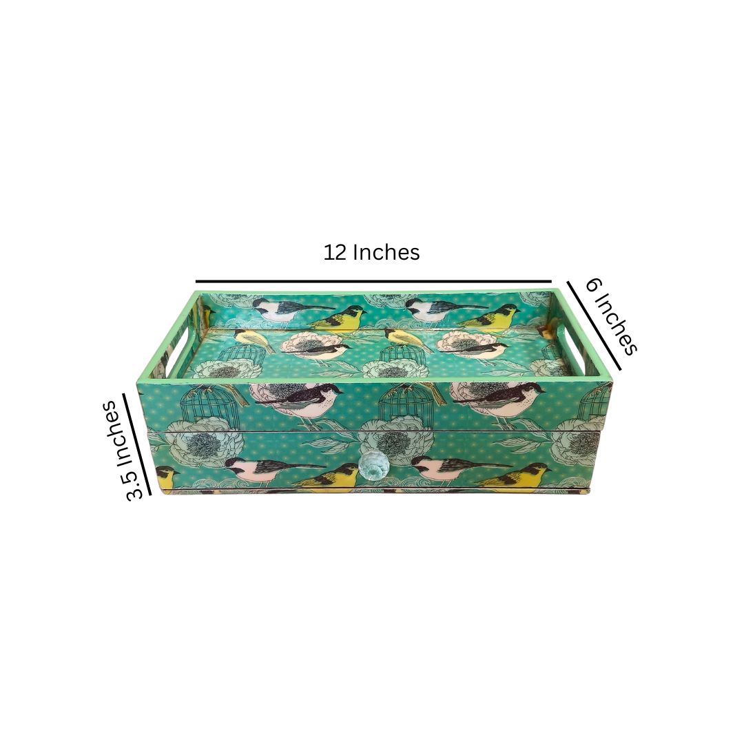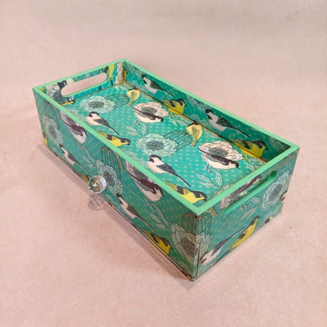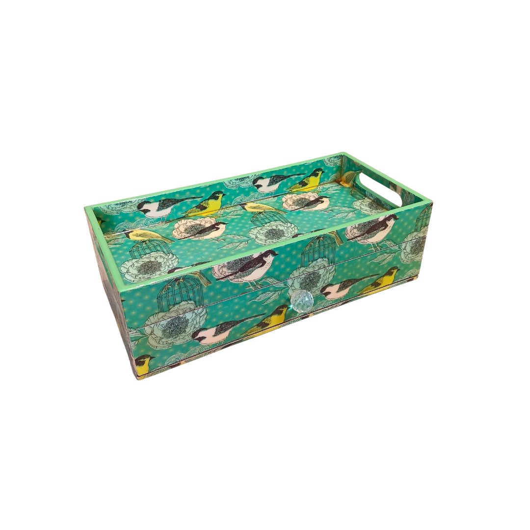 Single Tray - Wooden Tray With Drawer Bird printed & Enamel